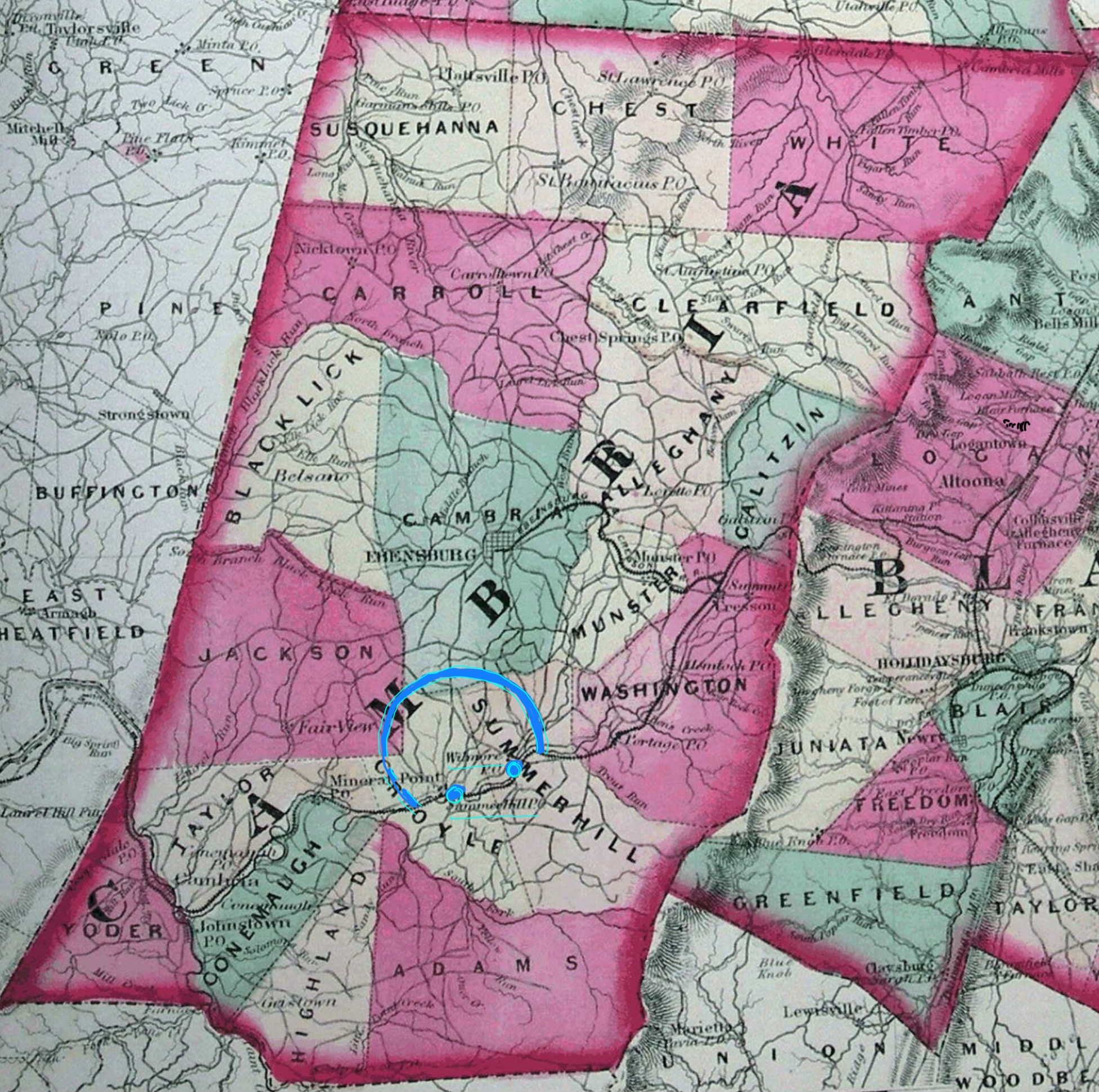 This 1872 map shows adjacent Summerhill and Croyle Townships (labeled on an angle in capital letters). The added blue dot on the left shows the settlement of Summerhill, which was then part of Croyle Township and known during earlier periods of its history as Croyle’s Mills, Half Way, or Sommer Hill. Summerhill became a borough independent of Croyle Township in 1892.